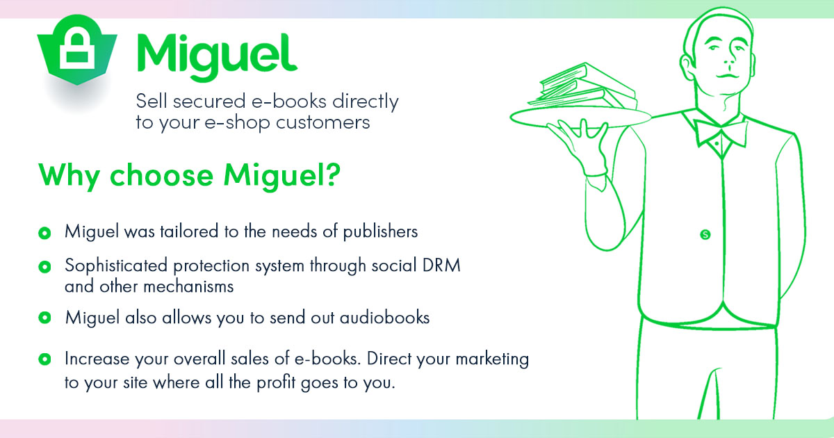 Are you a publisher or an author/self-publisher thinking about starting to sell books electronically? Or do you already sell e-books, but so far you only use other distributors and this option is missing on your own e-shop? In both cases, Miguel is the ideal solution for you. It is easy to use, fast, safe and reliable. Plus, it allows you to direct your marketing to your site where all the profit goes to you.